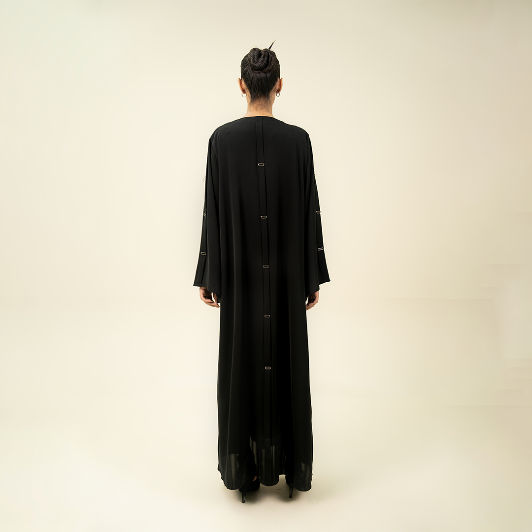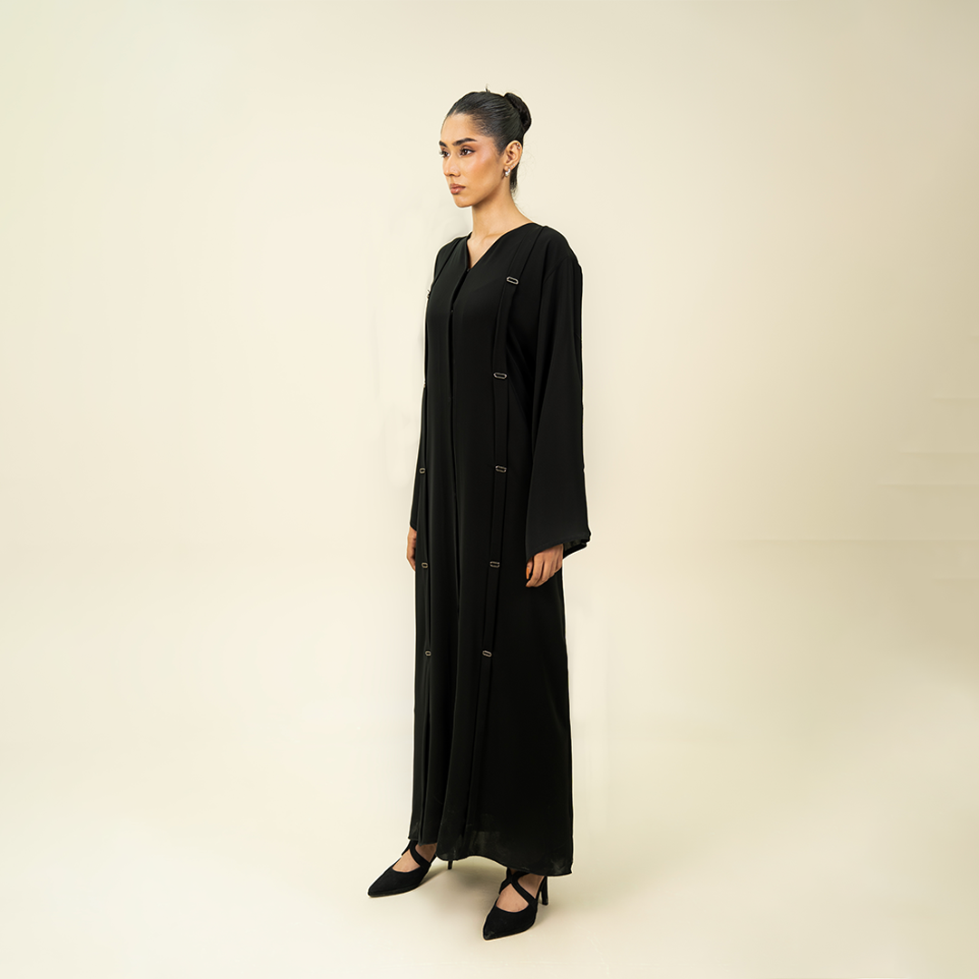 - Design: Coat-style lapel with vertical beaded embellishments