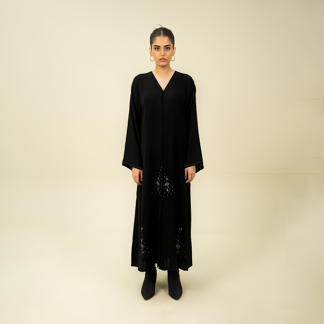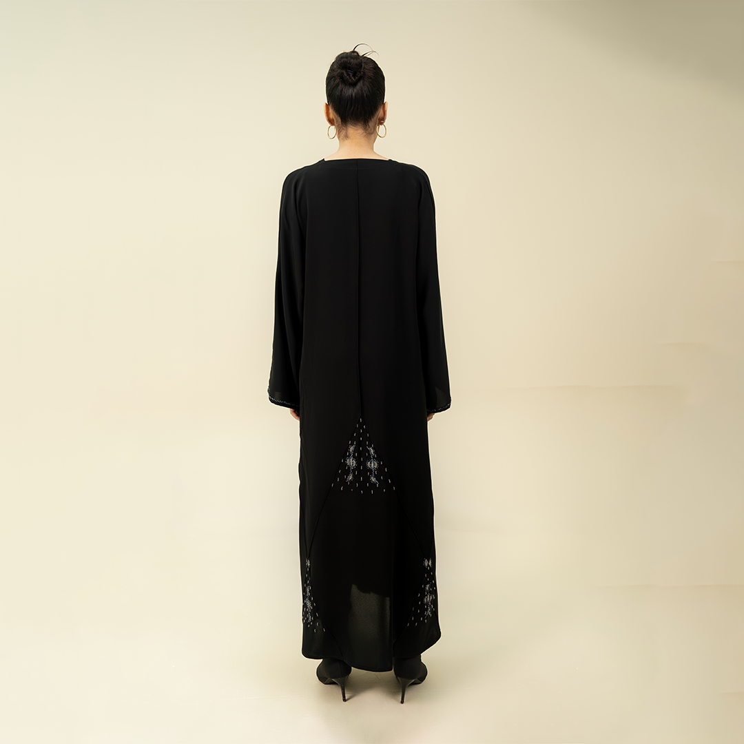 - Design: Bold two-tone floral embroidery (pink/grey) on sheer fabric detail at the cuffs and lower sides